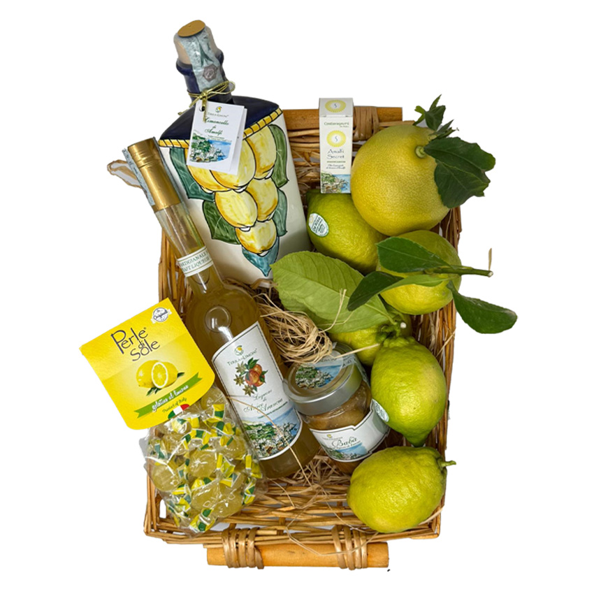 Premium Christmas basket with fresh lemons, lemon candies, two liqueurs of your choice, lemon babà, “Amalfi Secret” essential oil, and handcrafted ceramic limoncello. After placing your order, you will be contacted to select the liqueurs to include.